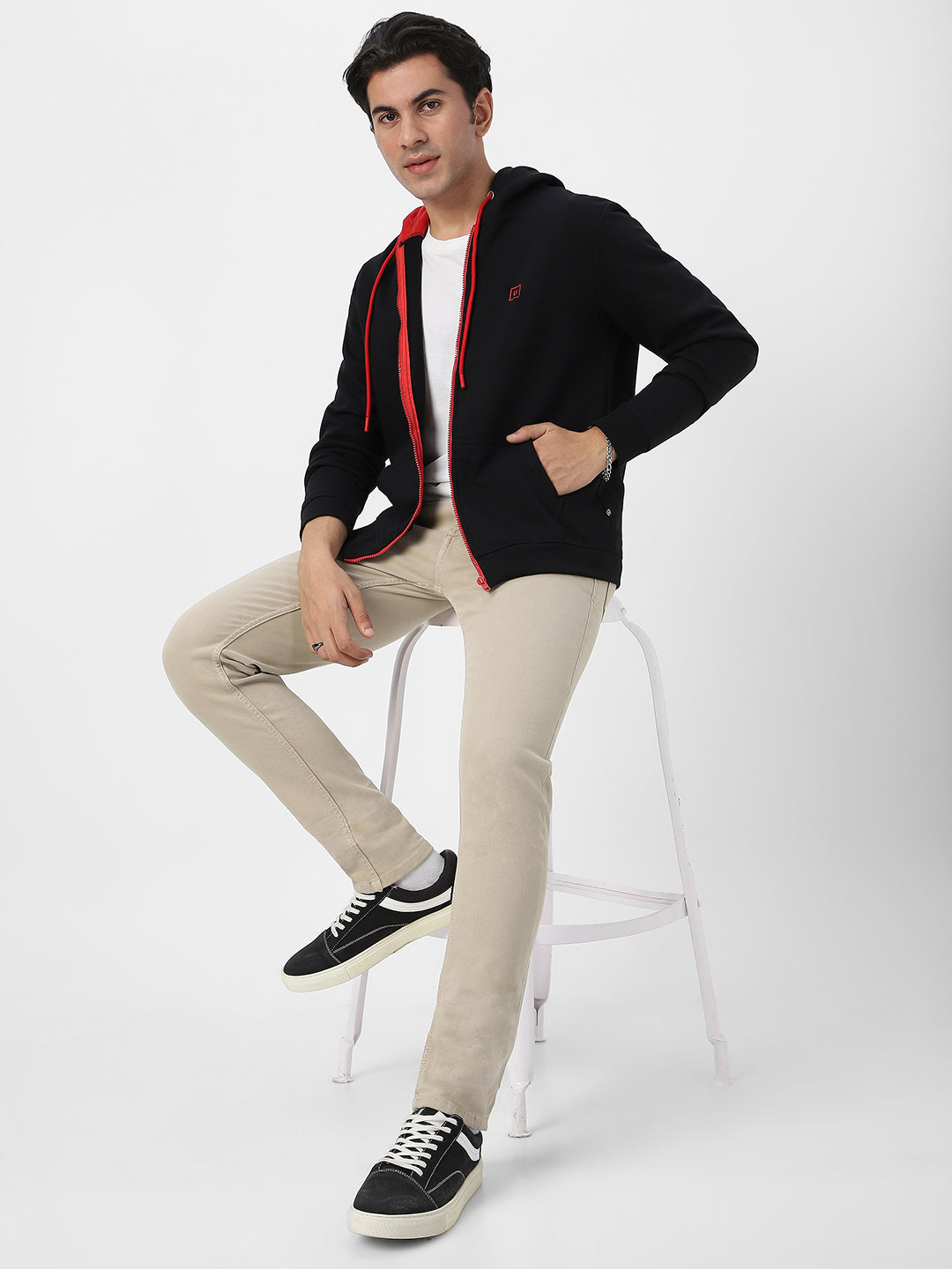 Men's Black, Red Cotton Zippered Hooded Sweatshirt