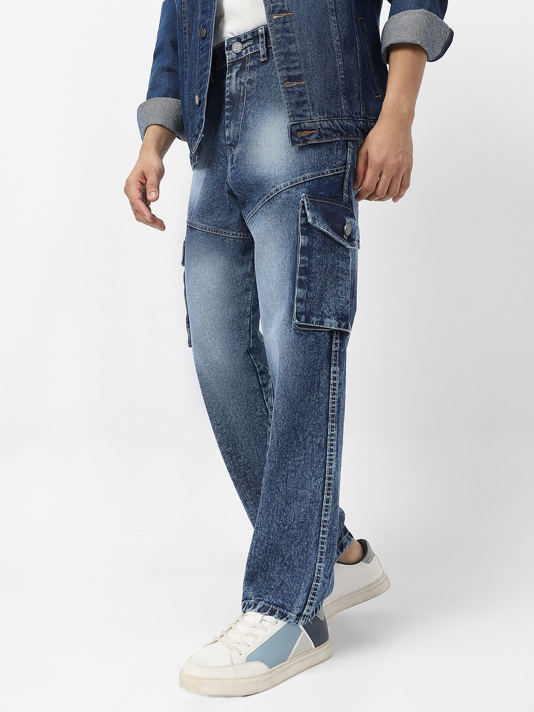 Men's Blue Loose Baggy Fit Washed Cargo Jeans with 7 Pockets Non-Stretchable