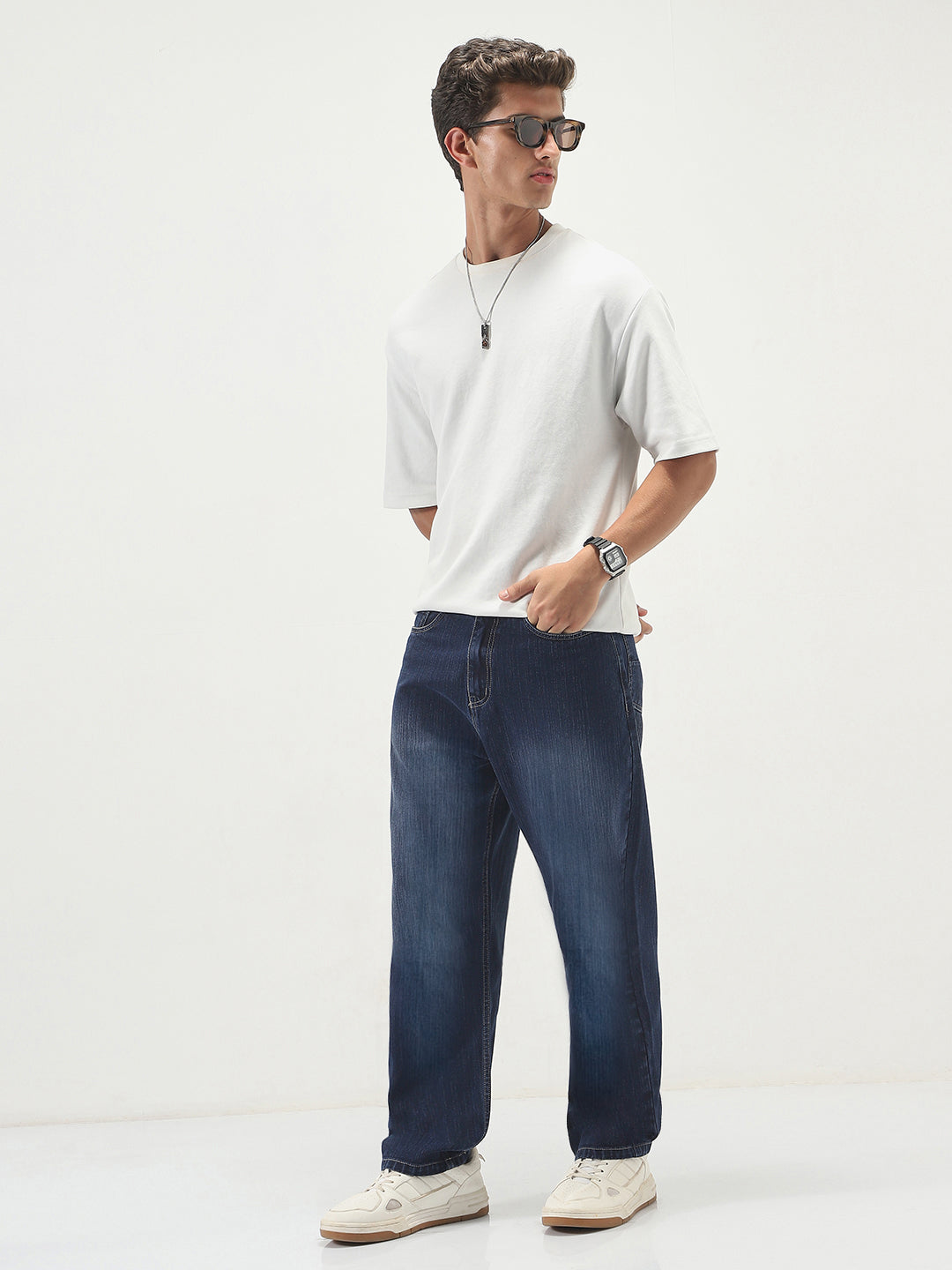 Men's Dark Blue Loose Baggy Fit Washed Denim Jeans Non-Stretchable