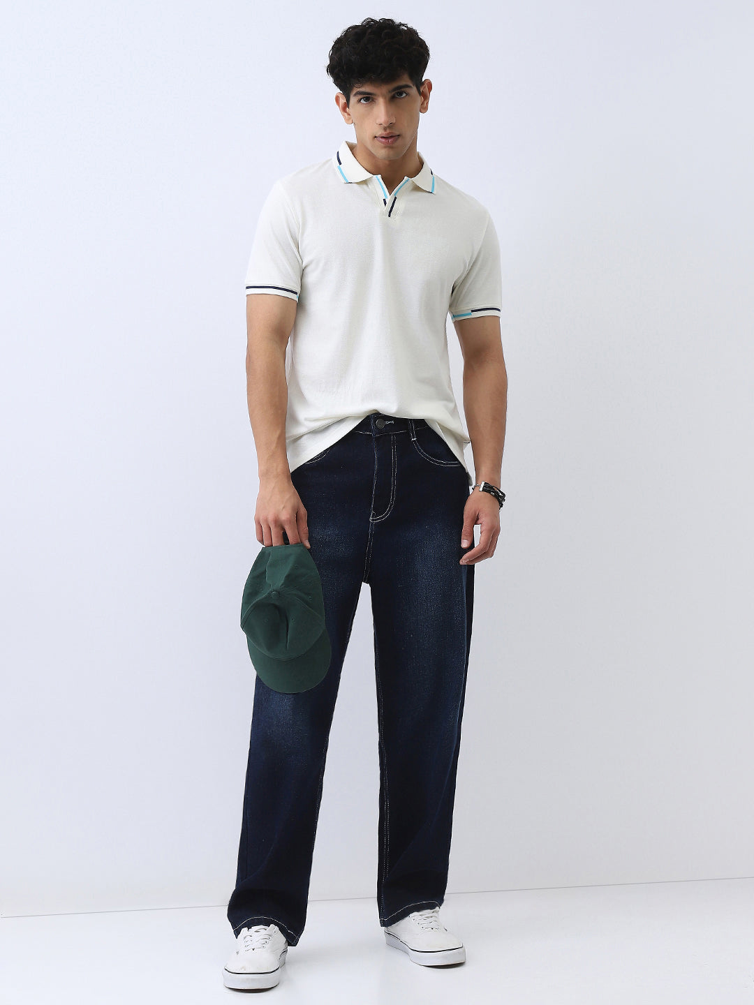Men's Dark Blue Loose Baggy Fit Washed Jeans Non-Stretchable
