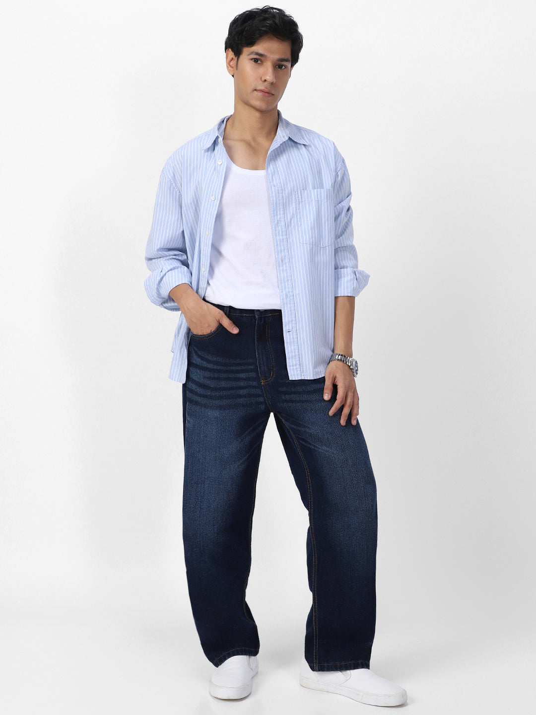 Men's Dark Blue Loose Baggy Fit Washed Jeans Non-Stretchable