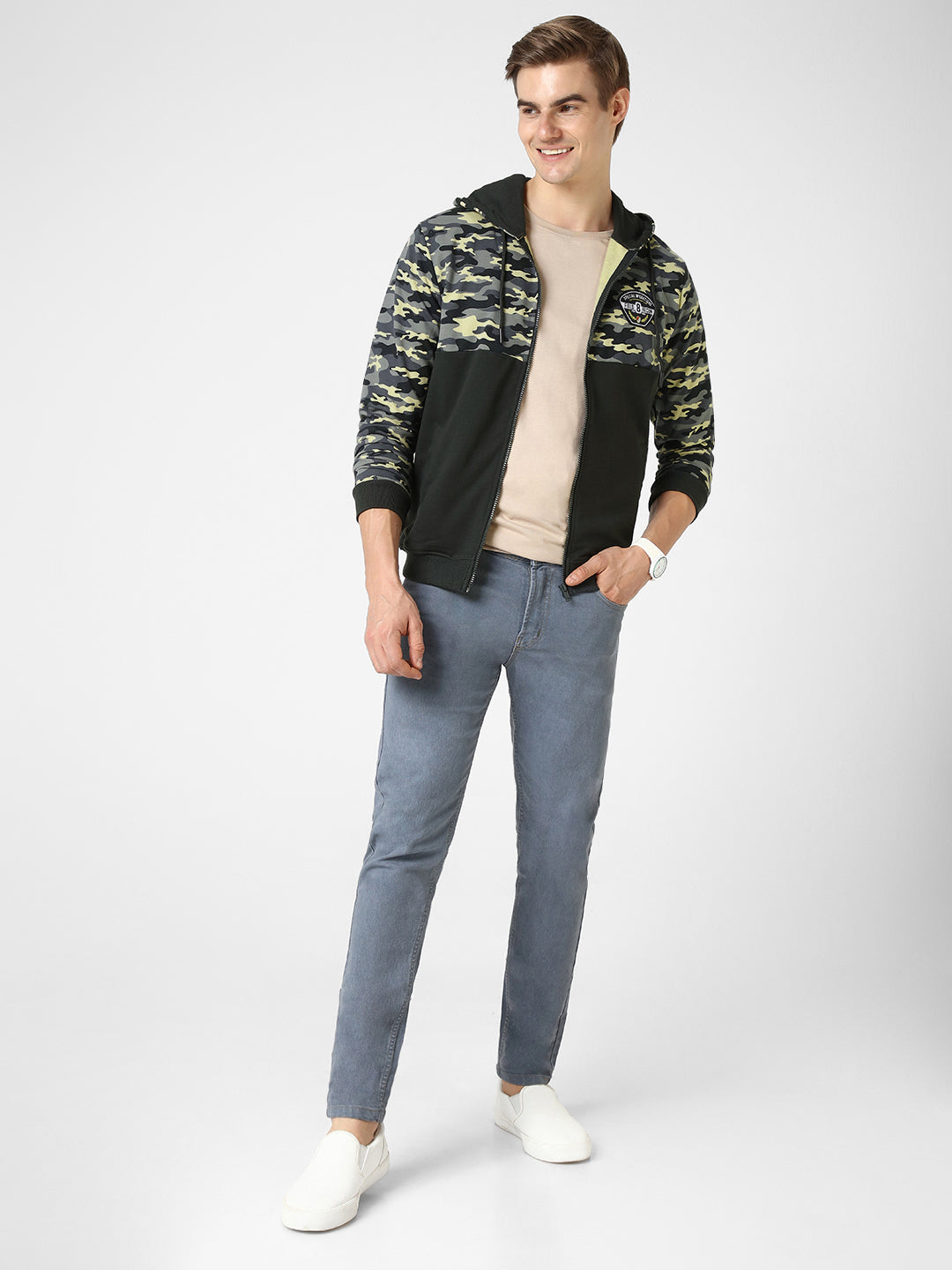 Make heads turn and stay stylishly warm in this latest trending design of Urbano Fashion men's grey military camouflage printed pattern with badges on chest cotton hooded neck sweatshirt, which brings the latest trend for the fashion conscious. The in-vogue camouflage printed design with printed badges on chest; 2 slant pockets; soft, warm & premium cotton fabric, front full zipper closure, hooded neck with drawsting closure, Regular Fit & Ribbed hem, full sleeve with ribbed cuff, make it a wardrobe must-have. Pair this fashionable and comfortable full sleeve sweatshirt with any Urbano Fashion jeans, trousers, shorts for the perfect casual, evening, gym wear or party wear look, and never go out of style!