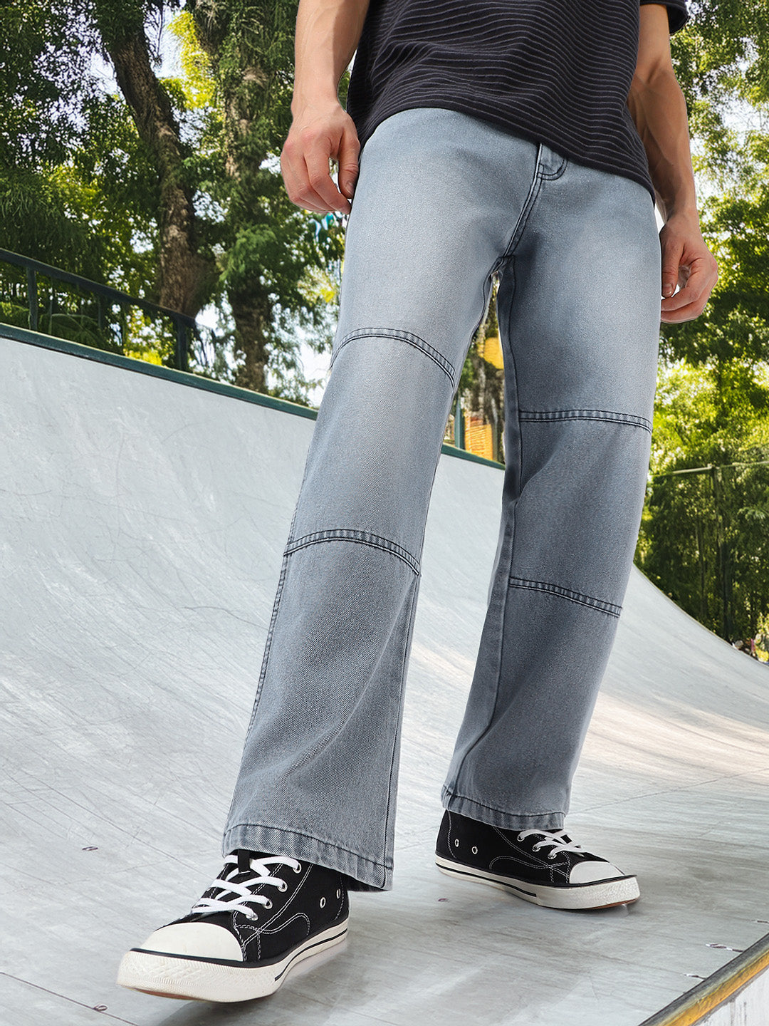 Men's Grey Loose Baggy Fit Cut and Sew Panelled Jeans Non-Stretchable