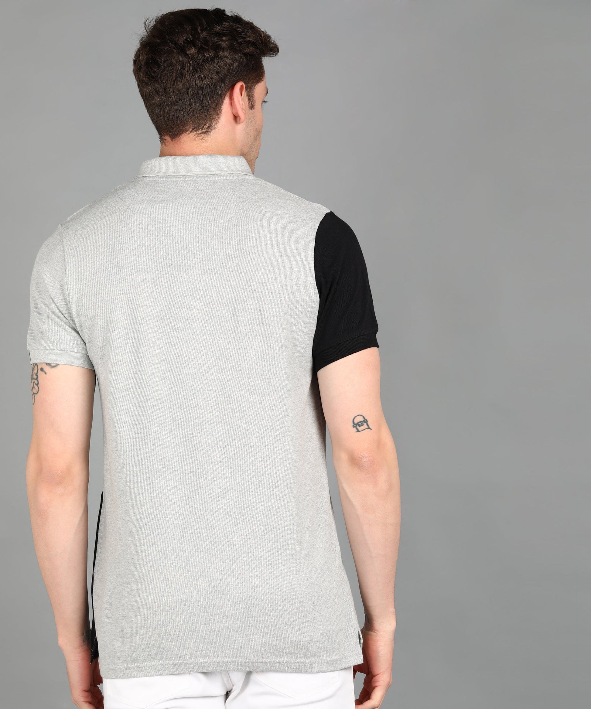Men's Grey Melange, Black Colour-Block Slim Fit Half Sleeve Cotton Polo T-Shirt