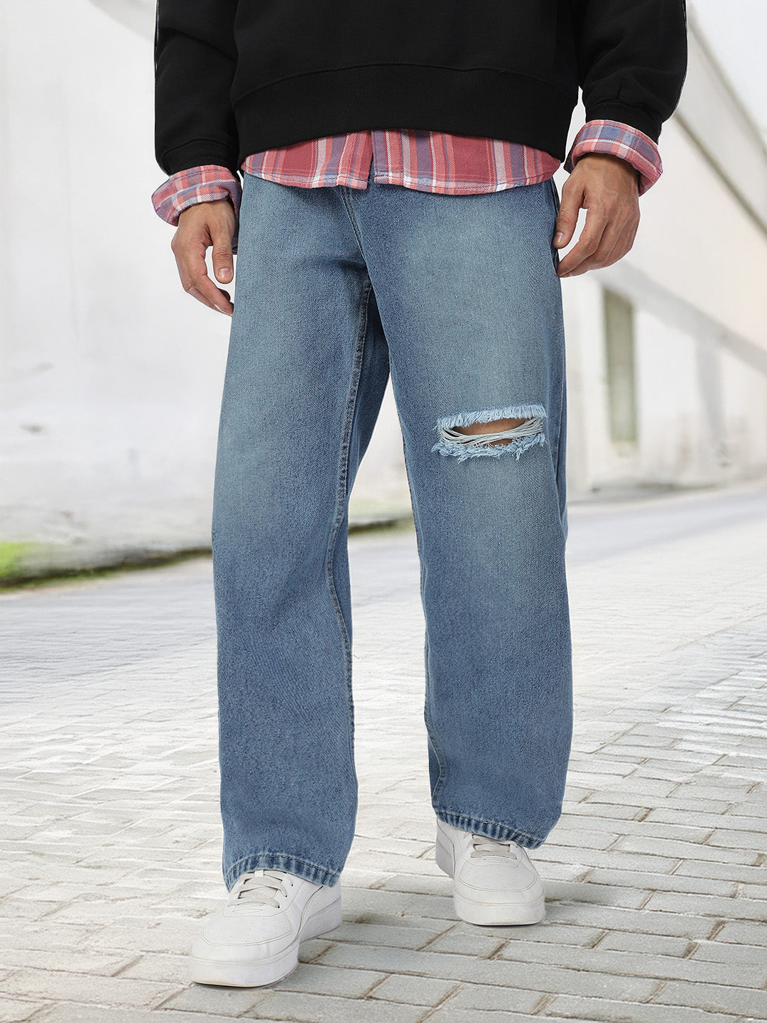 Men's Light Blue Loose Baggy Fit Washed Distressed/Torn Jeans Non-Stretchable