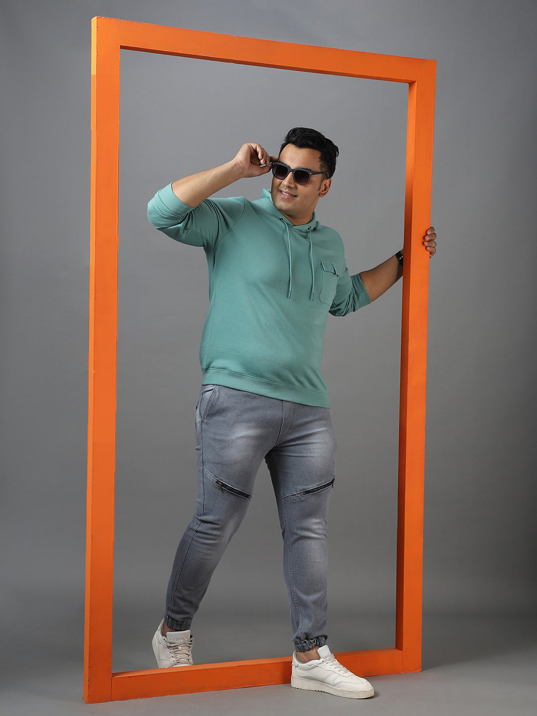 Plus Men's Light Green Cotton Solid Hooded Neck Sweatshirt